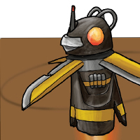 A flying, chopping, helicopter-ish, birdy robot. It flys around using its blades and rocket-assist booster. It will hover then charge with its spinning blades. Watch your head!