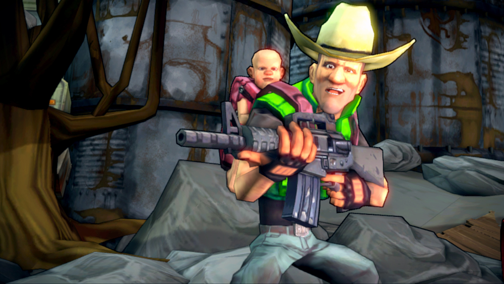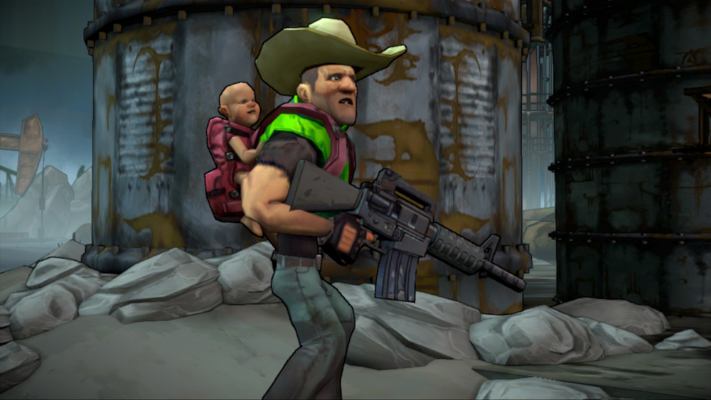 Einer der “Gegenstände”, die sich Walter auf den Rücken schnallen kann, ist eine Babytrage ... mit seinem Baby darin. Dieser Gegenstand hat einen sentimentalen Wert für uns, weil einige von uns während der Entwicklung von Shoot Many Robots selbst Babys bekommen haben. Du kannst sogar einen Erfolg/eine Trophäe abräumen, wenn du die Trage ausrüstest! Sämtliche Ausrüstung im Spiel wirkt sich auf Walters Statistik aus, verleiht ihm Tempo-Boots, Schadensmultiplikatoren und Spezialfähigkeiten. Mit der Babytrage erhält Walter +1 Baby. Wie im wahren Leben, ist es sowohl eine Last als auch ein Segen, sich seine Nachkommenschaft auf den Rücken zu schnallen.