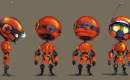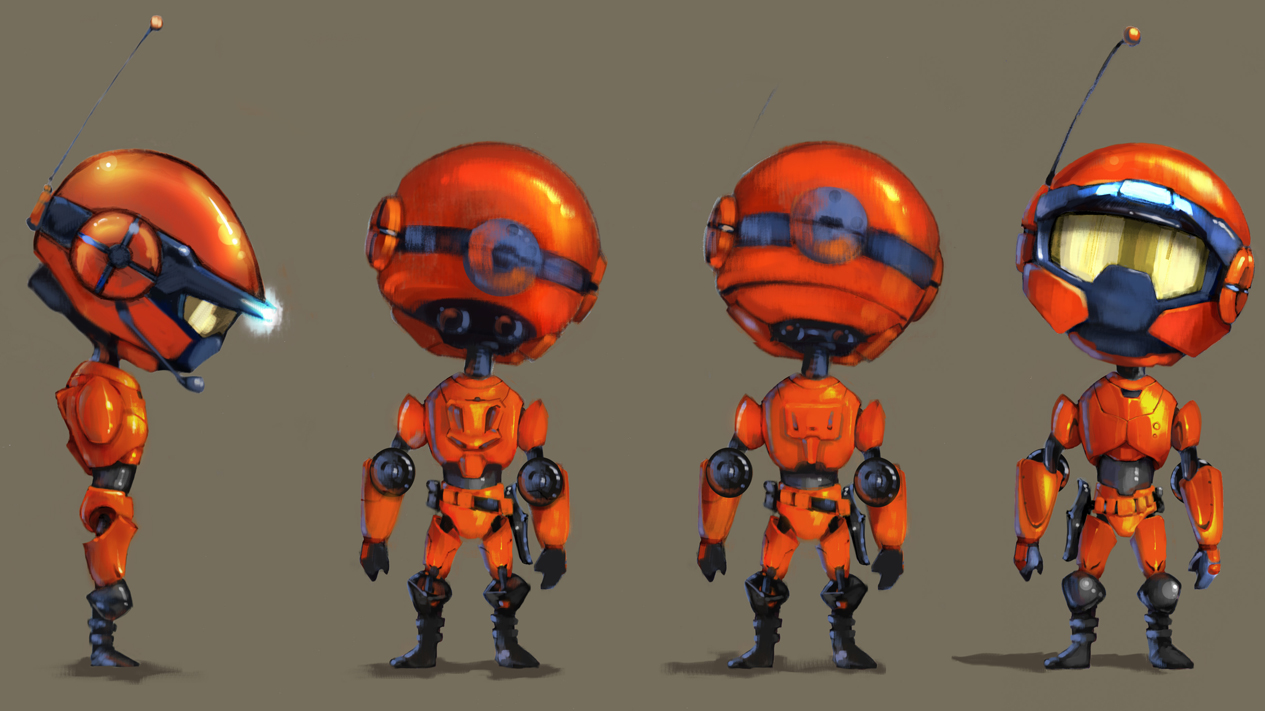 Als wir mit der Entwicklung unserer Hauptfigur begannen, entwarfen wir einen kleinen, flinken Charakter im orangefarbenen Metallanzug. Damals hatten wir noch eine schicke Science-Fiction-Welt im Kopf und dieser Avatar war von aerodynamischen Motorrädern inspiriert. Um ihm Charakter zu verleihen, sollte seine Antenne seine Gefühle widerspiegeln.