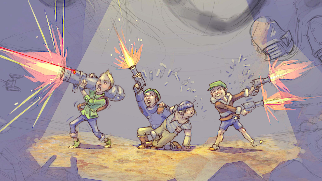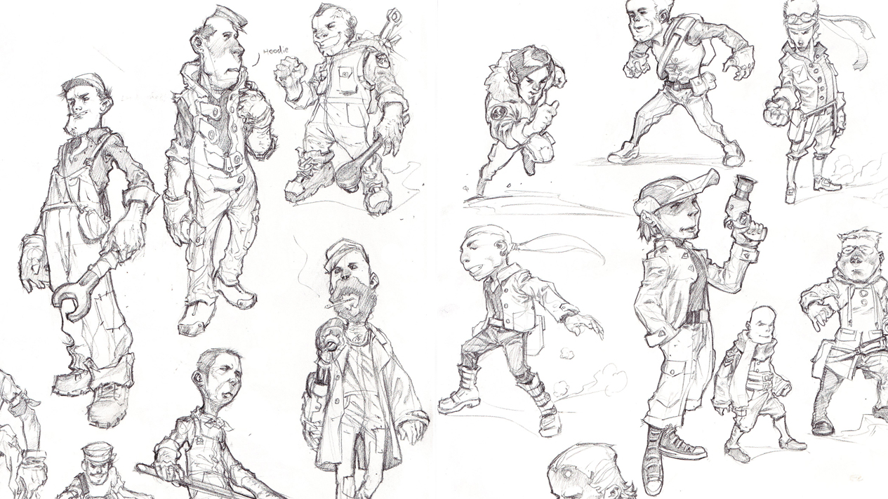 Als sich die Stimmung des Spiels zu einer düstereren, fast Steampunk-artigen Welt voller Dieselmaschinen und klapprigen Waffen wandelte, änderten wir auch das Aussehen unseres Protagonisten. Wir spielten mit der Idee von vier Kids, die gemeinsam versuchen, die Robokalypse aufzuhalten, verwarfen dieses Konzept aber irgendwann, weil Kinder dann irgendwie doch nicht zur Stimmung der Erwachsenenwelt passten, die wir entwickelten.