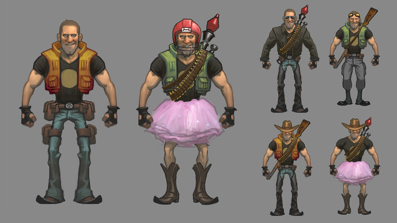Dieser einfache, draufgängerische Mechaniker-Charakter entsprach schon fast unserer Idealvorstellung, besaß aber noch nicht genug Wiedererkennungswert. Inspiriert von Heavy aus Team Fortress 2 und Tallahassee aus Zombieland, erschufen wir ein trotteliges Landei namens P. Walter Tugnut (das ““P”” steht für Pickles). Wie auch Tallahassee hat Walter im Erwarten der Robokalypse Waffen, Munition und Bier in seinem Wohnwagen gehortet ... und heute ist der beste Tag seines Lebens, denn endlich hat sie begonnen.